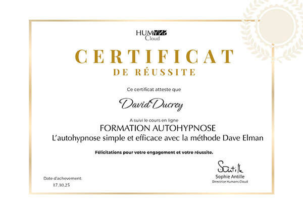 Peu à peu, cette pratique devient un outil d’évolution personnelle que vous pouvez utiliser à vie. Elle vous offre la liberté d’évoluer par vous-même, avec confiance et clarté. Ainsi, l’autohypnose de Dave Elman devient une clé d’équilibre intérieur et de transformation durable, que vous pourrez appliquer dans chaque domaine de votre vie.